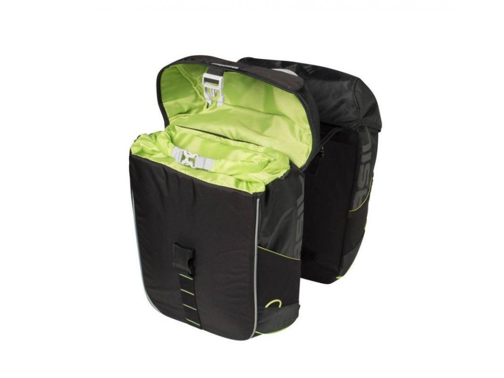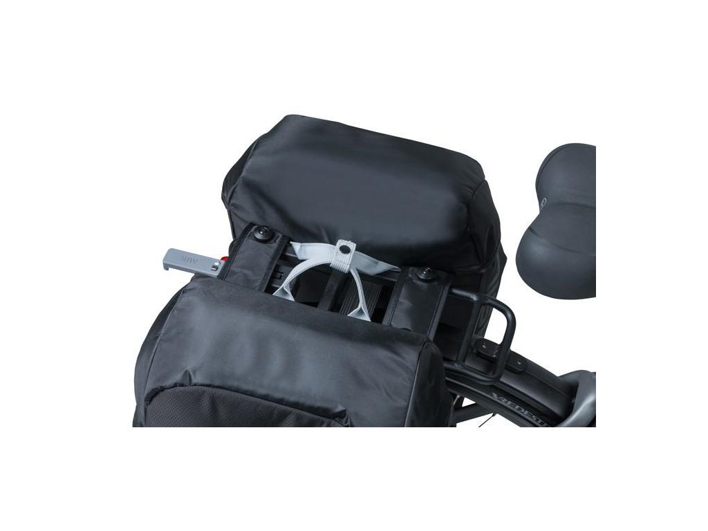 Basil Miles Double je voděodolná dvoj-bag s objemem 34 litrů. Po stranách jsou dvě extra elastická kapsa, šikovná na přepravu lahve s nápojem nebo deštníku. Ideální na přepravu nákupů nebo na rekreační jízdu na bicyklu. Pokud náhle začne pršet, vaše věci zůstanou suché. Taška je vodoodolná a má rolovací zapínání na vrchu s vrchním překrytím. Reflexní detaily vás zviditelní pro ostatní účastníky silničního provozu. Na tašku můžete také zavěsit další LED světla, má několik oček pro LED osvětlení. Tato taška má nainstalovanou desku adaptéru MIK (70171). Díky tomu se snadno odnímá. Desku adaptéru zacvaknete do nosiče se systémem MIK, nebo pokud nemáte nosič MIK, použijete adaptér MIK Carrier Plate 70170 na nosič (prodává se samostatně). Používání je potom velmi jednoduché! Zacvaknete a se stejnou lehkostí ji zase vycvaknete. S kapacitou 34L můžete toho odvést opravdu hodně. Extra reflexní části a možnost přidání LED osvětlení dělají jízdu na bicyklu bezpečnější ve tmě. Dodáváno včetně MIK adaptéru. Vhodné pro nosiče systému MIK 70170 (není součástí balení). Nosnost: 10 kg, maximálně 5 kg na jednu tašku. Systém: MIK. Adaptér 70171 (součástí balení). Rozměry: 34 cm x 17 cm x 43 cm (vnější rozměr).