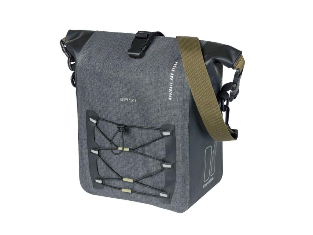 S taškou na bicykel Basil Navigator Storm MIK SIDE ve velikosti M si vybíráte sportovní a funkční tašku na kolo. S touto taškou se můžete vydat na jakékoli dobrodružství. Je 100% voděodolná, vyrobená z kvalitní voděodolné (IPX3) látky. Funkční design zajišťuje, že v této tašce snadno přepravíte všechno, co potřebujete. Všechno bylo myšleno tak, abyste si co nejprakticky vzali své věci kamkoli jdete. Díky nastavitelnému elastickému šňůrku je prostor pro cyklistickou helmu nebo bundu a tašku lze jednoduše uzavřít rolovacím uzávěrem. Tento rolovací uzávěr lze připevnit třemi způsoby. Cestování ve tmě? Žádný problém! S reflexními logy Basil na 3 stranách budete viditelní. Vždy budete připraveni. Pomocí systému MIK SIDE ji můžete rychle a jednoduše připevnit či vyměnit příslušenství na nosiči. S MIK SIDE tak na svůj nosič nejen nasadíte tašku nebo košík, ale můžete si další tašky zacvaknout i na boční stranu nosiče. Tento praktický systém vám umožní pohodlně nasadit a sundat jakoukoli tašku z kola během několika sekund. Co potřebujete? Tašku s MIK SIDE a nosič se třemi upevňovacími body. Pokud takový nosič nemáte, stále můžete tento šikovný systém používat pomocí samostatně dostupného adaptéru MIK Frame. Vlastnosti: Snadno se připevní na jakékoli kolo, včetně E-biků, díky systému MIK Side. Kompaktní a přesto s dostatkem úložného prostoru. Voděodolnost (IPX3) Objem: 12-15 litrů Rozměry: 34 x 28 x 19 cm (Vnější rozměry) Montáž: na bok nosiče přes MIK Side Materiál: Tarpaulin / Polyester Max.nosnost: 5kg