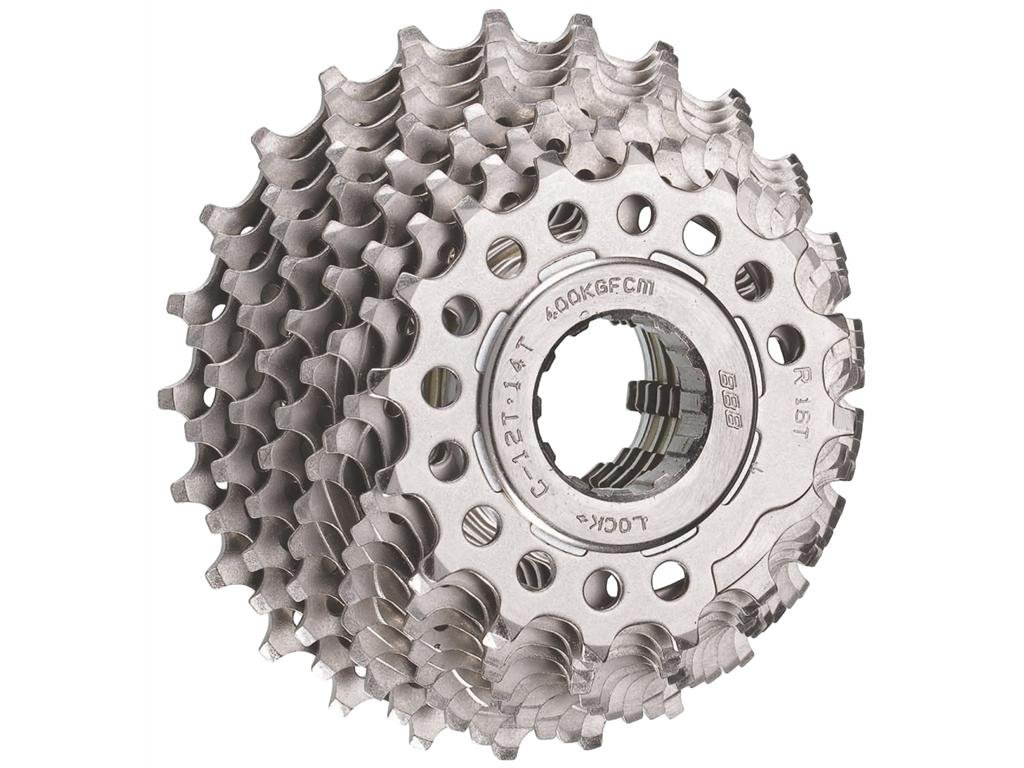 10 prev. kazeta kompatibilní s Campagnolo. Extra tvrdé pochromované pastorky do hloubky 1,2 mikronu. Jednotlivé pastorky s nylonovými podložkami. Rozsah převodů: 14/15/16/17/18/19/20/21/23/25 16/17/18/19/20/21/22/23/24/25