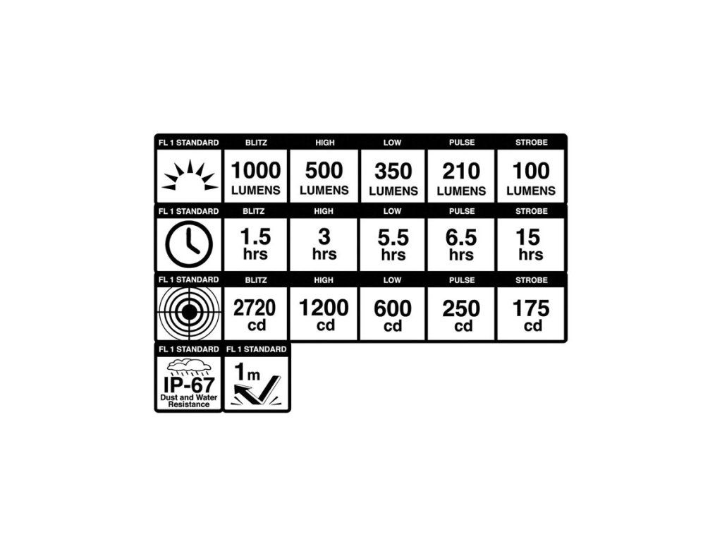 MÓDY Blitz 1000 lumenů/1,5 h, High 500 lumenů/3 h, Low 350 lumenů/5,5 h, Pulse 210 lumenů/6,5 h, Strobe 100 lumenů/15 h