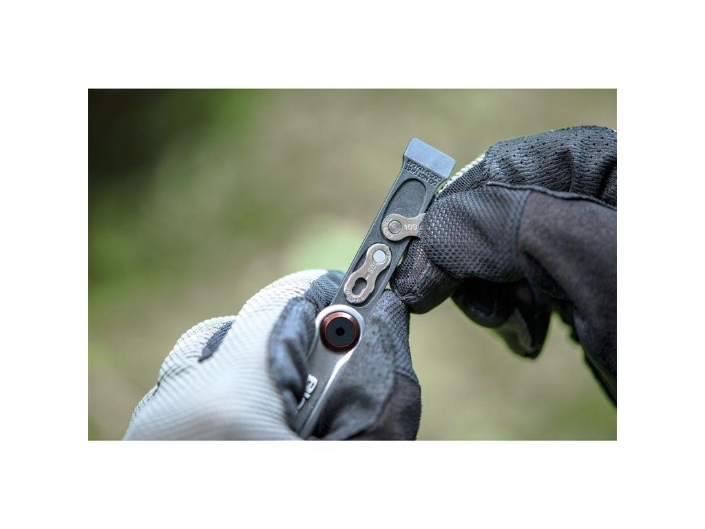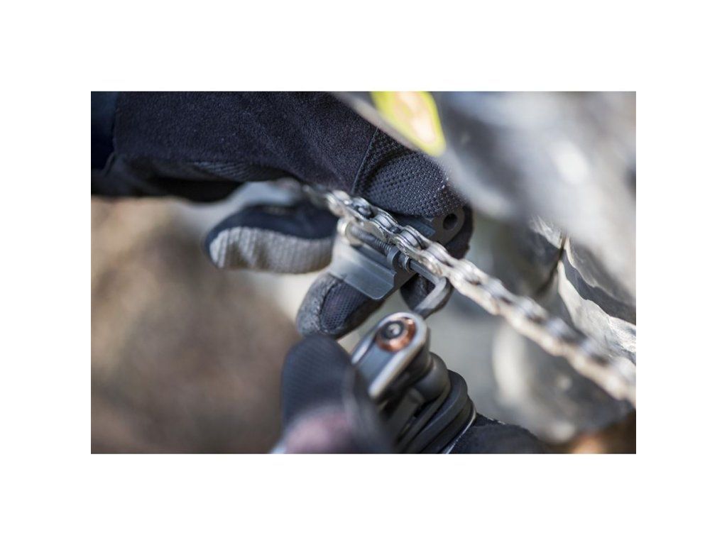 Kompaktní sada 18 nářadí s unikátním nástrojem na rozpojení zatuhlých rychlospojek řetězu a úložištěm pro náhradní rychlospojku.