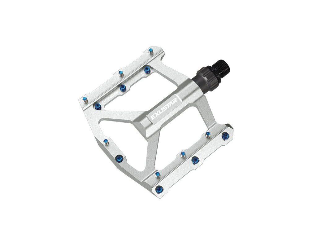 Nízkoprofilové pedály Exustar E-PB557 jsou vyrobeny z eloxovaného hliníku s CrMo osou a tenkým ložiskovým systémem (LSL). Pro lepší kontakt s botou jsou pedály na obou stranách vybaveny protiskluzovými vyměnitelnými piny.