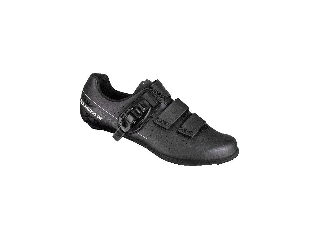 Sportovní silniční tretry Exustar. Tvarovaný, pohodlný svršek z PU kůže s prodyšnou síťovinou a sponou Microlock. Podrážka z kompozitu nylonu a skleněných vláken má zabudované větrací otvory Air Control, které vás ochladí, a protiskluzové výstupky