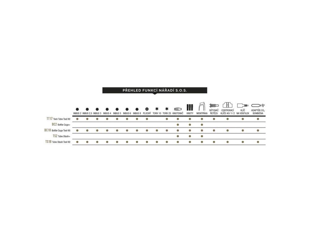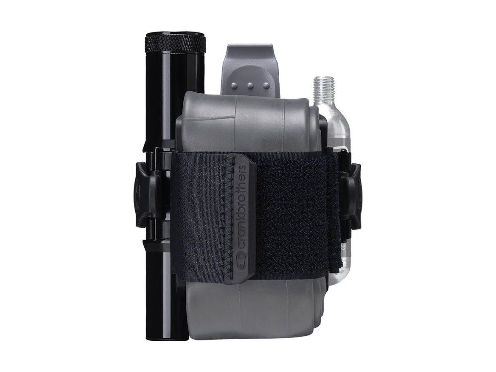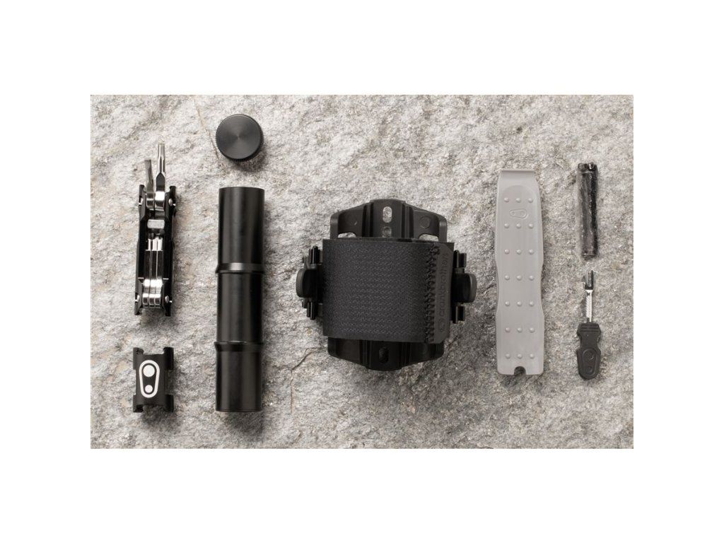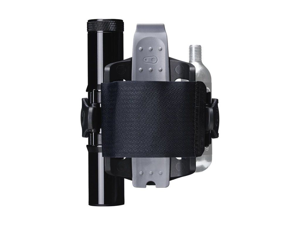 Držák náhradní duše nebo dalšího vybavení s páskem na suchý zip. Montáž místo košíku. V bočním úložném prostoru našlo místo velké multifunkční nářadí a na druhou stranu košíku je možné připnout CO2 bombičku nebo minipumpu.