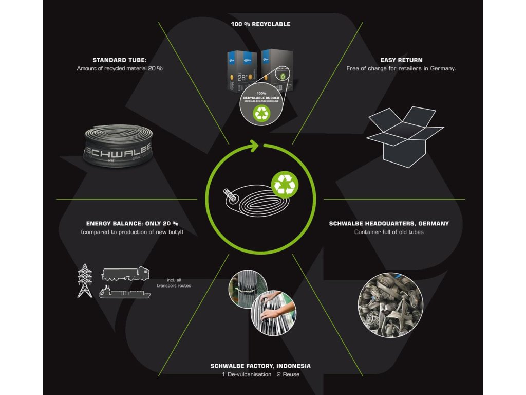 Každá duša Schwalbe je 100% recyklovateľná. Bez straty kvality môžeme pri výrobe nových duší použiť recyklovaný materiál. V našej továrni sme vyvinuli špeciálny proces devulkanizácie a už niekoľko rokov sa ukazuje, že veľmi úspešné. Aktuálne každá štandardná duša od Schwalbe pozostáva z 20% z recyklovaných starých duší.