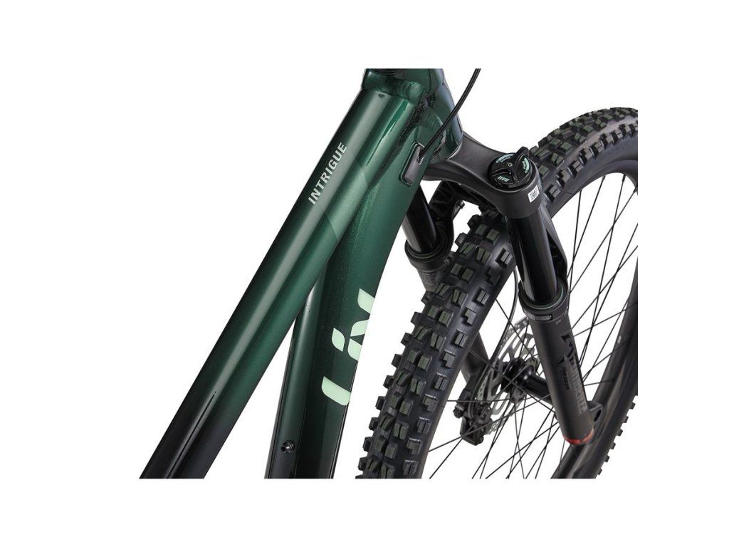 CELOODPRUŽENÝ TRAIL BIKE INTRIGUE 29 JE NABÍZEN TAKÉ V CENOVĚ DOSTUPNĚJŠÍM HLINÍKOVÉM PROVEDENÍ. STEJNĚ JAKO KARBONOVÁ VARIANTA DISPONUJE ZDVIHY 140/125 MM A MÁ NASTAVITELNOU GEOMETRII. INTRIGUE 29 JE URČEN PŘEDEVŠÍM PRO TY BIKERKY, KTERÉ TU NEJTĚŽŠÍ ČÁST TRAILU POVAŽUJÍ ZA SVOU OBLÍBENOU PASÁŽ, ALE I PRO TY MÉNĚ ZKUŠENÉ, KTERÝM POMŮŽE ZDOKONALIT TECHNIKU JÍZDY V NÁROČNĚJŠÍM TERÉNU. HLAVNÍ PŘEDNOSTI Hliníkový rám ALUXX SL a karbonové vahadlo Intrigue 29 je postaven na hliníkovém rámu ALUXX SL. Pro výrobu těchto rámů používáme vysoce kvalitní slitinu a pokročilé výrobní metody a procesy – díky tomu je rám velmi lehký, ale zároveň dostatečně tuhý a pevný. Horní vahadlo odpružení je karbonové (technologie Advanced Forged Composite) – výsledkem je vyšší tuhost i pevnost a zároveň nižší hmotnost. Skvělé odpružení Maestro Zadní odpružení Maestro poskytuje zdvih 125 mm a vpředu s ním perfektně spolupracuje vidlice se zdvihem 140 mm. Systém Maestro funguje na principu virtuálního (plovoucího) středu otáčení zadní stavby, odpružení je díky tomu plně aktivní a vysoce citlivé. Zároveň je eliminováno nežádoucí pohupování při šlapání, takže zbytečně neztrácíte energii a jedete plynuleji a rychleji. Nastavitelná geometrie Díky systému flip chip můžete měnit geometrii kola v závislosti na terénu nebo stylu jízdy. Slouží k tomu dvoupolohové vložky umístěné v horním vahadle odpružení – jejich otočením měníte především hlavový a sedlový úhel a výšku středu šlapání. Pro rychlý „agresivní“ terén je ideální nastavení do polohy Low, pozice High je naopak vhodná pro pomalejší a techničtější „XC“ terén. RÁM VELIKOST S BARVA Kelp Forest RÁM ALUXX SL-grade aluminum front and rear triangles, 125mm Maestro Suspension, flip chip – Maestro VIDLICE Marzocchi Bomber Z2, 140mm, Rail damper, Boost 15x110, Kabolt, tapered, 44mm offset TLUMIČ Fox Float Performance 185x50, custom tuned for Liv KOMPONENTY ŘÍDÍTKA Giant Contact TR35, alloy, 35mm, 20mm rise S: 760mm, M: 760mm, L: 780mm GRIPY Liv Tactal Pro Single Lock-On S: 120mm, M/L: 130mm PŘEDSTAVEC Giant Contact SL, 35mm S: 50mm, M: 50mm, L: 50mm SEDLOVKA Giant Contact Switch dropper, adjustable, remote S: 120-150mm travel / 30.9 x 459mm M: 140-170mm travel / 30.9 x 499mm L: 140-170mm travel / 30.9 x 499mm SEDLO Liv Sylvia OSAZENÍ ŘAZENÍ Shimano Deore, 1x12 PŘEHAZOVAČKA Shimano Deore, Shadow + BRZDY Shimano BR-MT420, hydraulic, Shimano RT-26 rotors [F]180mm, [R]180mm BRZDOVÉ PÁKY Shimano BL-MT401 KAZETA Shimano Deore M6100, 10x51 ŘETĚZ KMC X12 KLIKY Praxis Cadet, steel chain ring 30t, 52mm chainline S: 170mm, M: 170mm, L: 170mm STŘED Praxis, press fit KOLA RÁFKY Giant AM 29, tubeless ready, sleeve-joint, 30mm inner width NÁBOJE [F] alloy 15x110, sealed bearing, [R] alloy 12x148, sealed bearing DRÁTY Sapim PLÁŠTĚ [F] Maxxis Minion DHF 29x2.5WT, 3C Max Terra, EXO, TR, tubeless [R] Maxxis Dissector 29x2.4WT, 3C Max Terra, EXO, TR, tubeless DOPLŇKY tubeless prepared, max tire size 2.5", max chainring size 32t