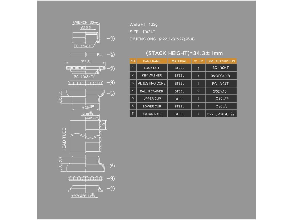 Oceľové závitové hlavové zloženie určené pre vidlice s 1" (25,4 mm) krkom so závitom. Pozostáva z 8 kusov. Guľôčkové ložiská poskytujú dostatočne hladký chod a sú ľahko servisovateľné. Zloženie je určené pre Trekkingové a Comfort bicykle.