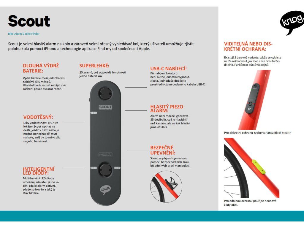 KNOG Scout je vodotěsný, snadno ovladatelný a nabíjetelný (přes USB-C) lokátor a alarm pro kola, který umožňuje sledovat, kde se vaše kolo nachází, i když zrovna nejezdíte. Absolutní změna v oblasti zabezpečení jízdních kol!
