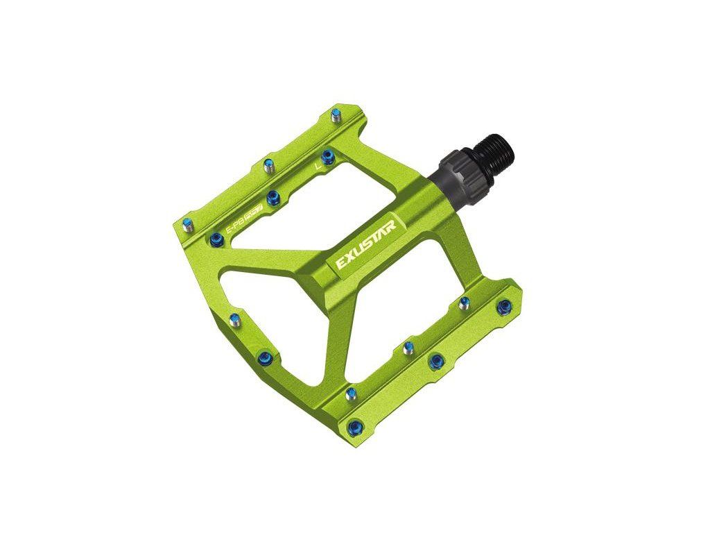 Nízkoprofilové pedály Exustar E-PB557 jsou vyrobeny z eloxovaného hliníku s CrMo osou a tenkým ložiskovým systémem (LSL). Pro lepší kontakt s botou jsou pedály na obou stranách vybaveny protiskluzovými vyměnitelnými piny.