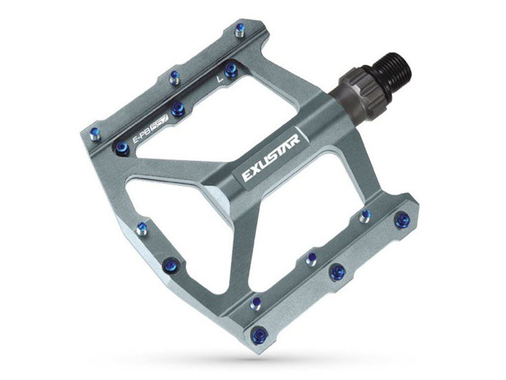 Nízkoprofilové pedály Exustar E-PB557 jsou vyrobeny z eloxovaného hliníku s CrMo osou a tenkým ložiskovým systémem (LSL). Pro lepší kontakt s botou jsou pedály na obou stranách vybaveny protiskluzovými vyměnitelnými piny.