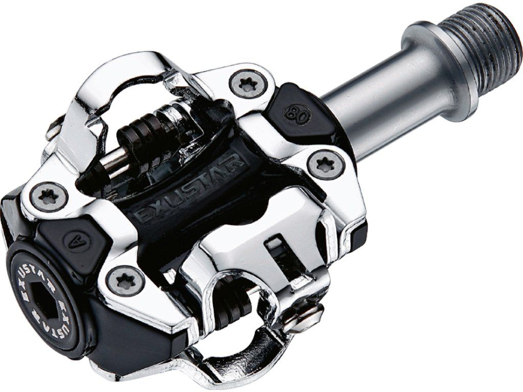 Lehké pedály Exustar PM213 s vynikajícím poměrem cena/hmotnost/kvalita. Kompatibilní se standardním systémem SPD.Hliníkové těloCr-Mo osa opracovaná CNCLSL těsnění - průmyslová ložiskaSPD oboustranný upínací mechanismusBrzdy (kufříky) součástí balení E-C05FSstříbrná barva