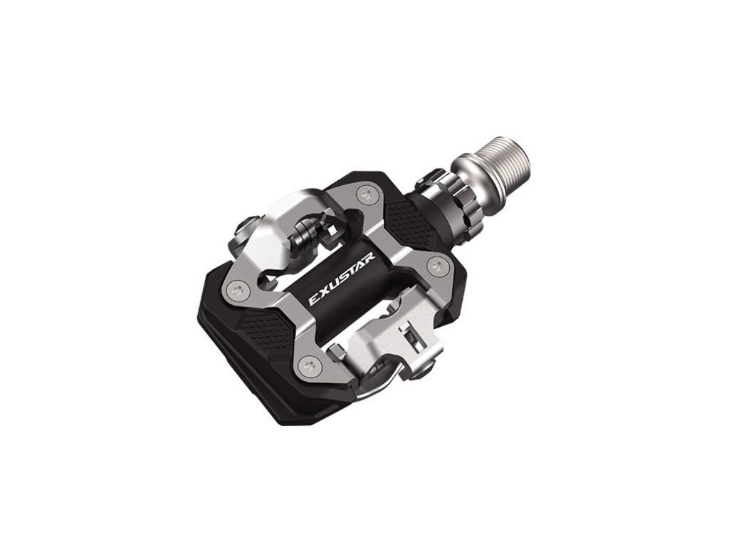 Exustar E-PM812 je univerzální trekingový pedál se třemi typy nášlapů. Na jedné straně je zámek SPD pro cyklistické tretry, na druhé straně platforma pro běžnou sportovní obuv. Tělo pedálu je vyrobeno z eloxovaného hliníku, CrMo osy a dvojitého ložiskového systému (kuličková ložiska). Jednostranná pouzdra jsou typu EPS-M (kompatibilní se Shimano MTB). Ložiska: kuličková ložiskaVosa: ocelTělo: HliníkRozměry: 100 x 66 mm