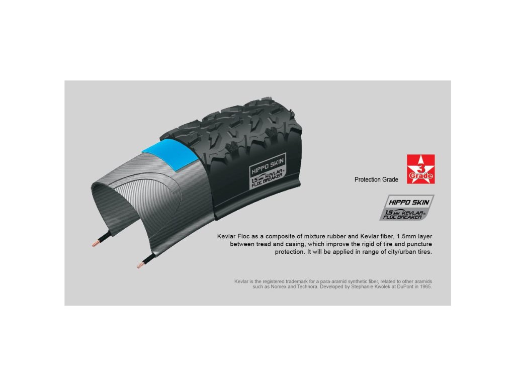 Unikátny šípový dizajn v spolupráci so širšou základňou behúňa poskytuje extrémne dlhú životnosť a odolnosť voči prepichnutiu. Centrálne hladké smerové plôšky zaručujú nízky valivý odpor umožňuje rýchlejšiu a pokojnejšiu jazdu. Vyvýšené okraje behúňa poskytujú vynikajúcu trakciu v zákrutách a lepšiu odozvu pre jazdca. 30TPI konštrukcia plášťa zabezpečuje dostatočnú pevnosť, odolnosť a v neposlednom rade aj životnosť plášťa. Ochrana proti prerazeniu HIPPO SHIN vložená medzi behúň a kostru plášťa je zložená zo zmesi strihaných Kevlarových vláken a gumy (Kevlar floc). Hrúbka vrstvy je 1,5mm a výrazne zlepšuje tuhosť plášťa a ochranu voči prerazeniu a prepichnutiu plášťa. Ochrana HIPPO SKIN je špeciálne vyvinutá pre mestské bicykle.