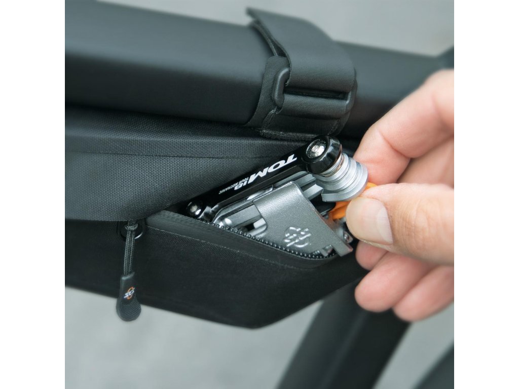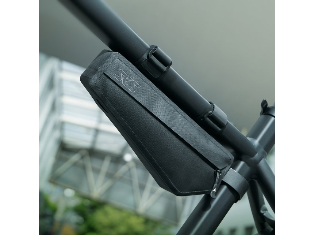 RACE FRAME BAG je nevyhnutností pro silniční cyklisty a gravel bikery. Díky odolnému vnějšímu materiálu se sváry je taška na kolo vhodná do všech povětrnostních podmínek. Boční zip Easyzip je chráněn krytem a dvě vnitřní kapsy poskytují prostor na peníze a další drobnosti. Taška je také vybavena reflexním logem a praktickými držáky zadních světel. Vhodná jako taška do rámu nebo na sedlovku Do rámového trojúhelníku se díky úzkému designu tašky SKS snadno vejdou i lahve na pití. Tašku lze bezpečně namontovat na rám kola nebo sedlovku pomocí extra dlouhých protiskluzových suchých zipů s ochranou rámu. Je možné ji namontovat i na aero sedlovky, přičemž háčky a suché zipy lze zkrátit a vyměnit. Pogumovaná horní část tašky chrání lak a poskytuje oporu na všech cestách. - Svářečný vnější materiál odolný proti stříkající vodě - Zkracovatelný suchý zip s ochranou rámu - Dvě vnitřní kapsy, reflexní prvky - Vhodná i pro aero sedlovky - Materiál: Polyester - Hmotnost: 90 g - Objem: 650 ml - Rozměry: 230 x 40 x 100 mm