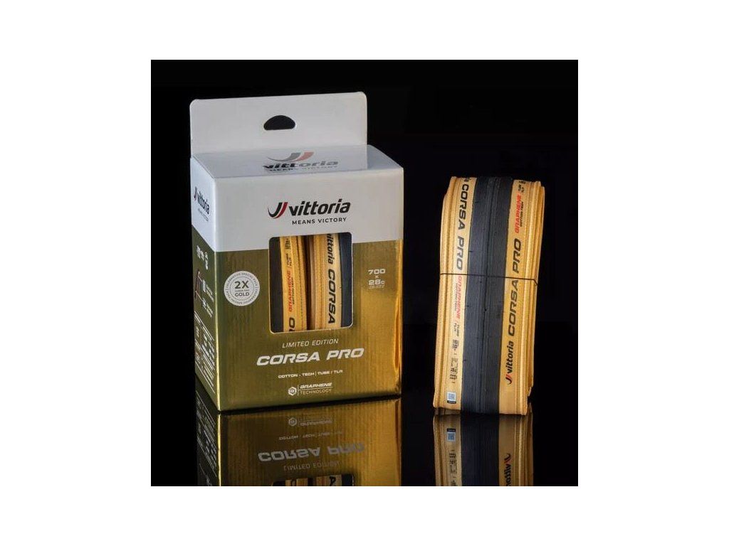 Na oslavu tohoto „zlatého roku“ jsme vyrobili unikátní a velmi limitovanou zlatou edici Vittoria Corsa PRO – celosvětově je k dispozici pouze 2023 balení, takže se jedná o skutečný sběratelský kousek pro ty největší nadšence a fanoušky silniční cyklistiky. Vittoria Corsa PRO Gold je zdobená zlatými bočnicemi a s ručně napsaným sériovým číslem na vnitřní straně pláště.