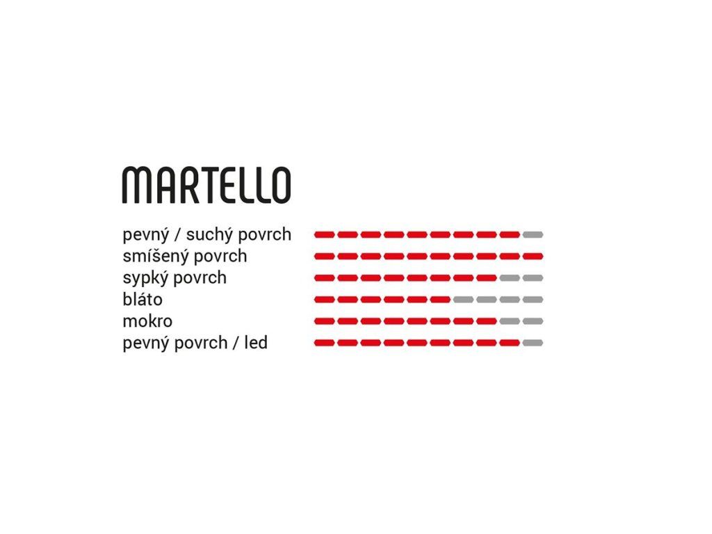 4C G+ směsi a vzorku inspirovaným motokrosovými chlupaticemi. Každý knob je rozbrázděn dvojicí hlubších lamel pro jistý grip i za mokra. Děsí vás špičaté kameny, kluzké kořeny, stále se měnící povrch, ostré náklony, prudké brzdění? Martello tyto vaše obavy rozbije na atomy.