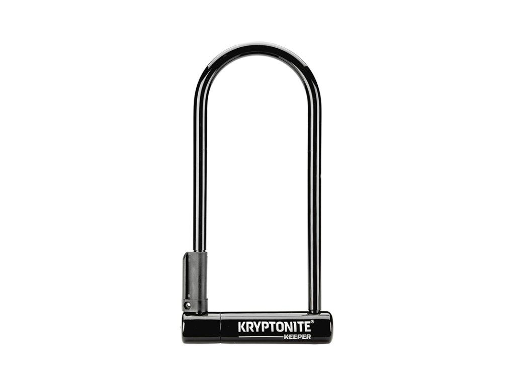 Zámek Kryptonite Keeper 12 Long s prodlouženou délkou, 12 mm ocelovou podkovou, mechanismem DEADBOLT, dvěma klíči a držákem na rám. Úroveň ochrany 5/10.