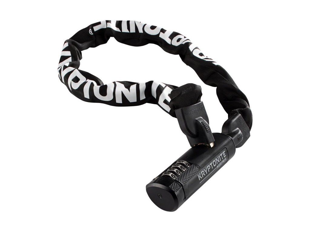 Odolný řetězový zámek Kryptonite o délce 120 cm a čtyřhrannými články z 3T manganové oceli. Nabízí 4-místný resetovatelný kód a bezpečnostní úroveň 5/10.